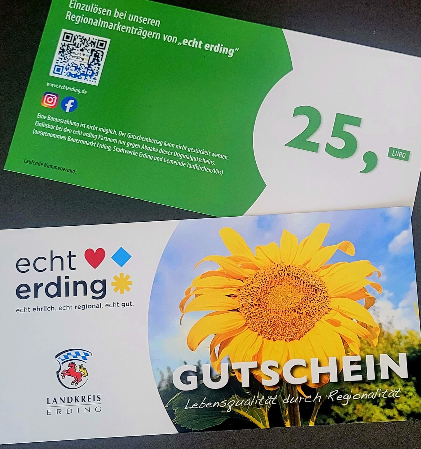 Ab Oktober können Bürgerinnen und Bürger „echt erding“-Gutscheine im Wert von 10 €, 25 € und 50 € erwerben. Diese Gutscheine sind eine ideale Möglichkeit, die regionalen Erzeuger und Betriebe zu entdecken und gleichzeitig die lokale Wirtschaft im Landkreis Erding zu unterstützen. Sie eignen sich perfekt als Geschenk für Familie und Freunde.